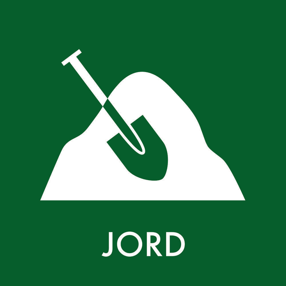 - Hvid jordbunke og skovl grafik på grøn baggrund med hvid JORD tekst